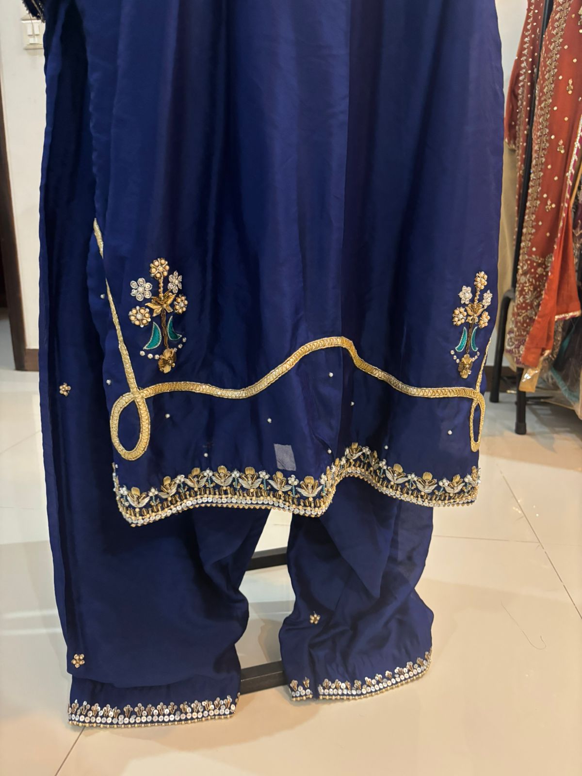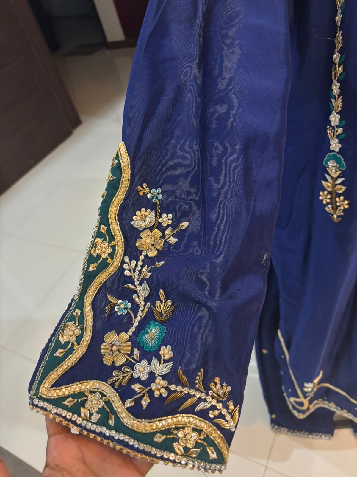 A luxurious pure sheesha silk outfit in royal blue, beautifully adorned with resham, sequins, and zardozi work that adds a touch of regal charm. The look is paired with a worked pant-shalwar, enhancing the richness of the set. Complemented by a contrast teal dupatta with an elegant finished border, this ensemble strikes the perfect balance between sophistication and contemporary finesse.