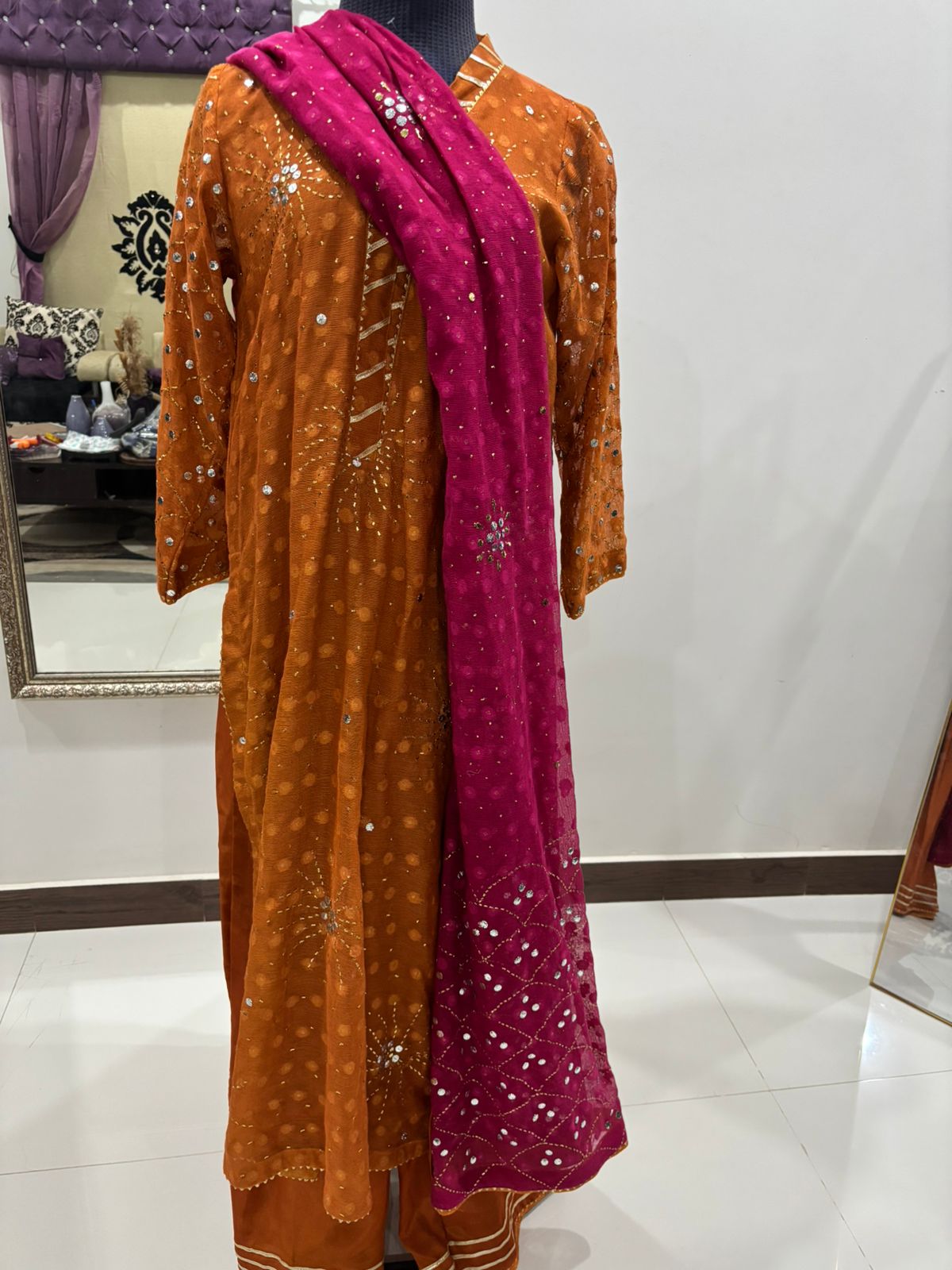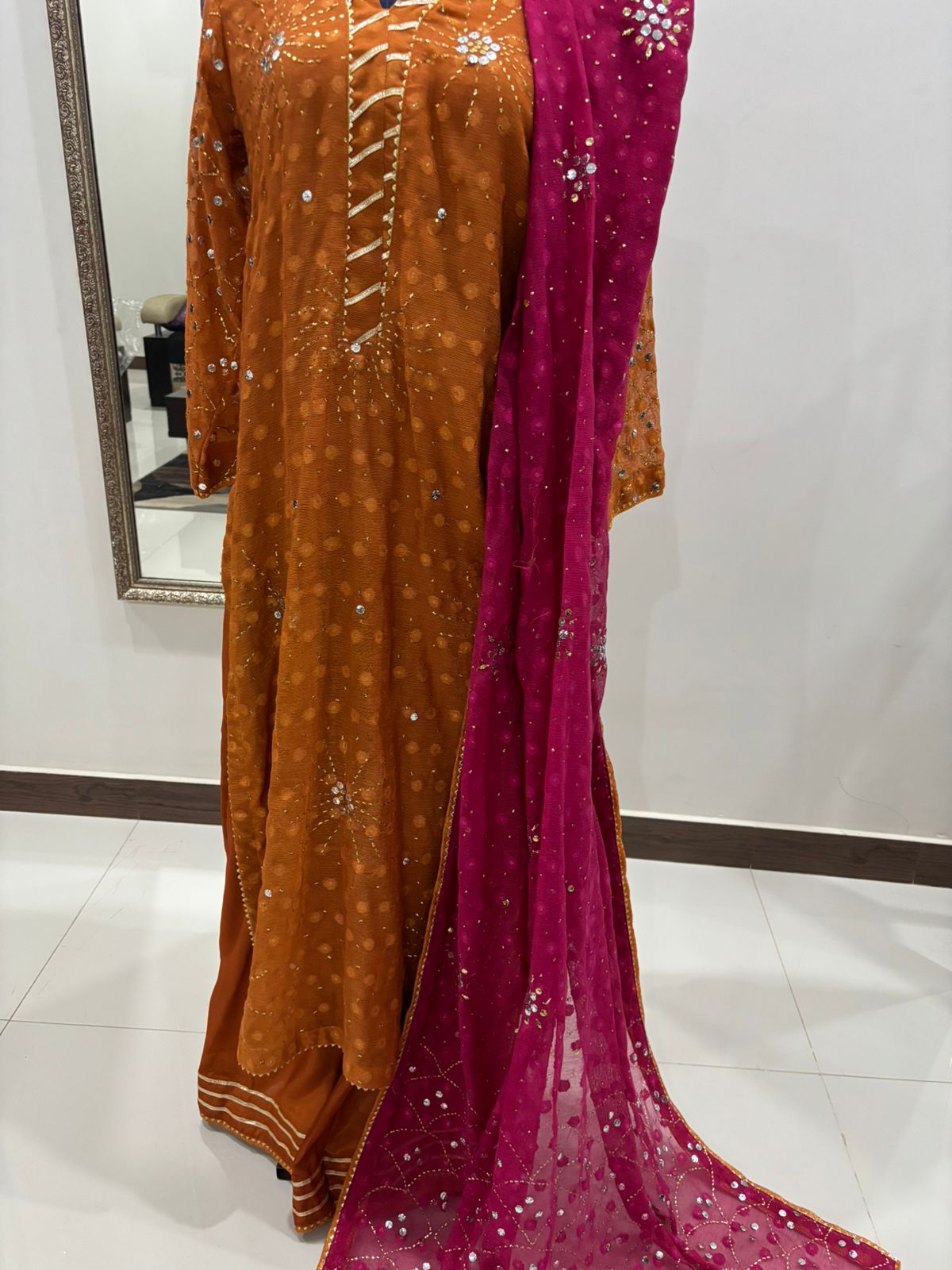 The outfit is paired with a 3-yard khadi net contrast hotpink dupatta adorned with heavy jaal and booties work, finished with gorgeous gotta and jamavar edging for a regal touch. Complementing the ensemble are flowy Russian silk pants, also featuring gota and jamavar detailing, creating a harmonious and luxurious silhouette perfect for festive or formal occasions