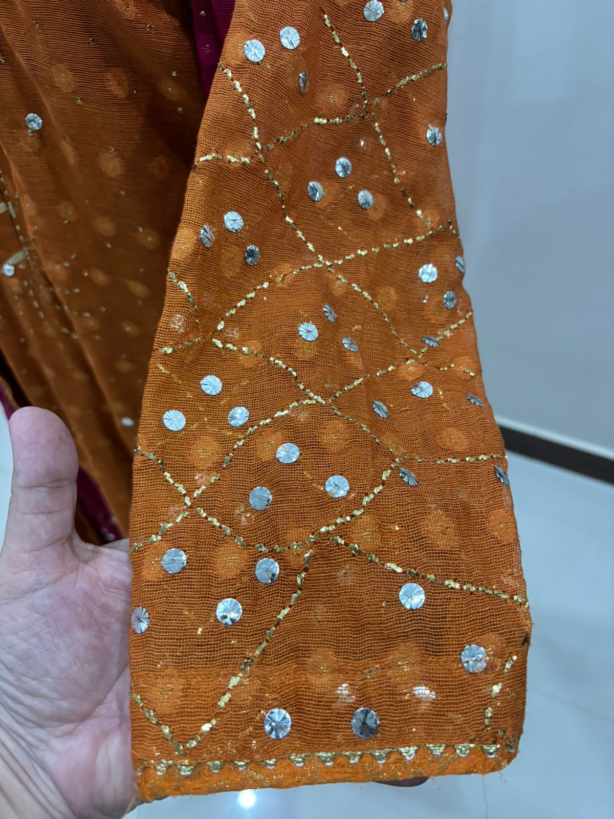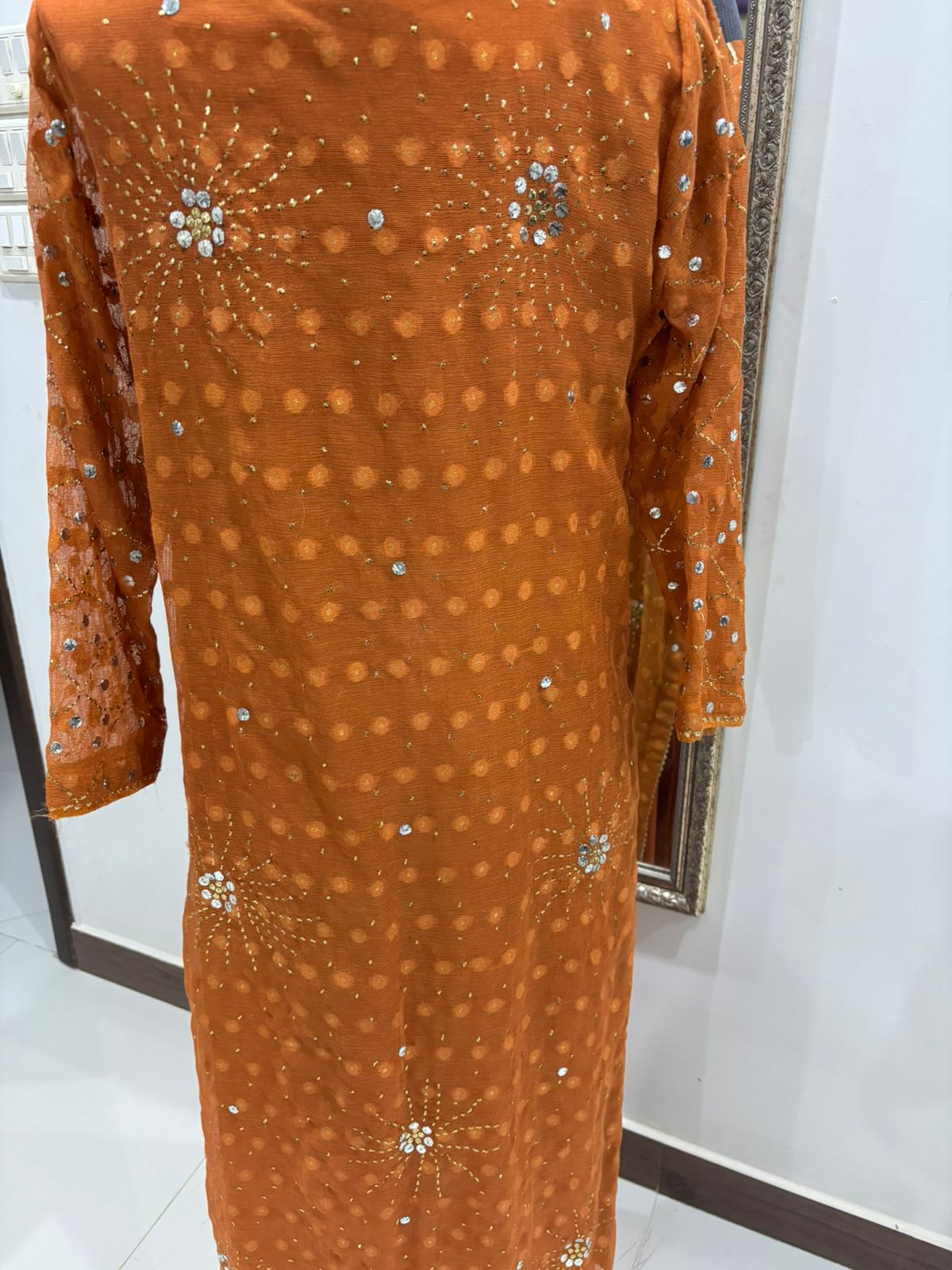 A stunning rust orange pure khadi net shirt featuring intricate gold and silver Mukesh work heavily detailed on both the front and back, with jaal work on the sleeves adding depth and elegance.
